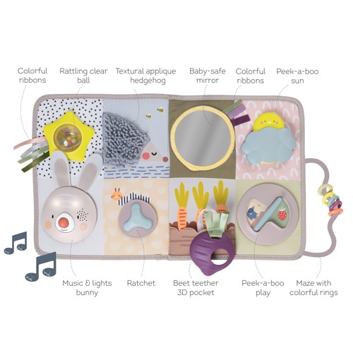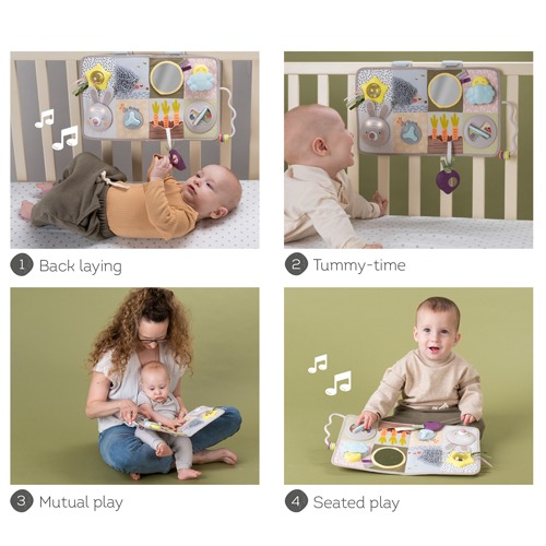- Includes 13 developmental activities for mutual play and exploration: music & lights bunny, peak-a-boo activities, rattling clear ball, ratchet, colourful ribbons, baby-safe mirror, maze with colourful rings and more.